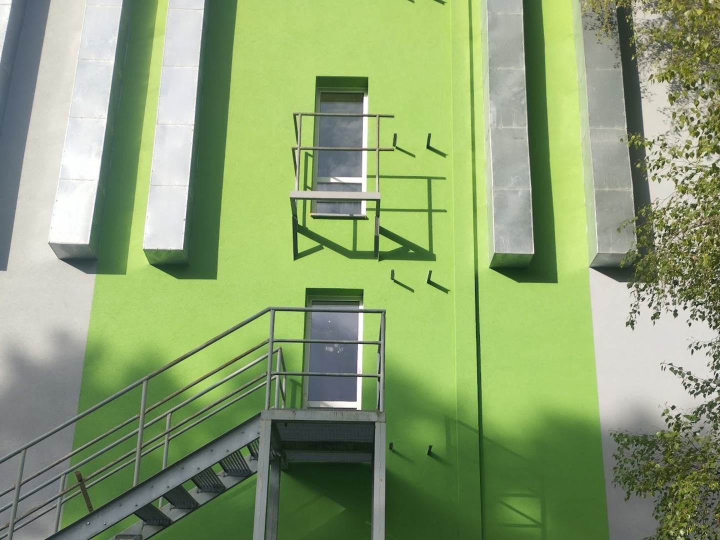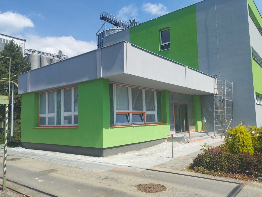 Po demontáži lešení jsme dokončili soklovou část objektu a také fasádu vrátnice, která je na administrativní budovu přímo napojena. Vrátnice byla zateplena a barevně sjednocena s hlavní budovou, aby celý areál působil jednotně.