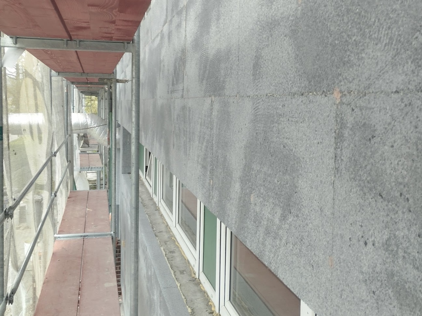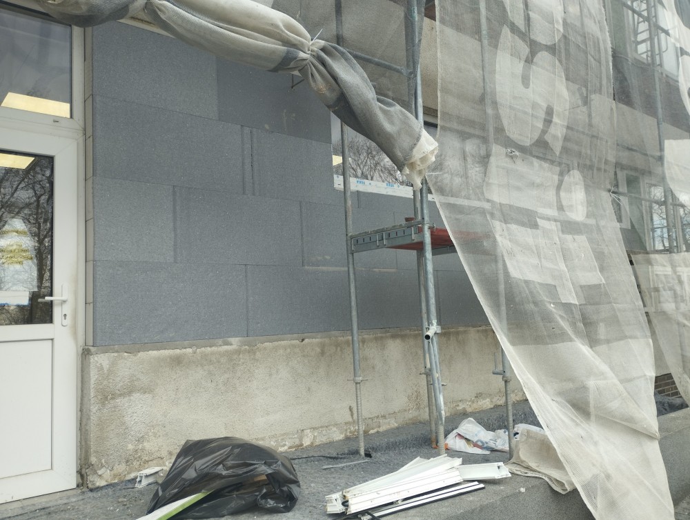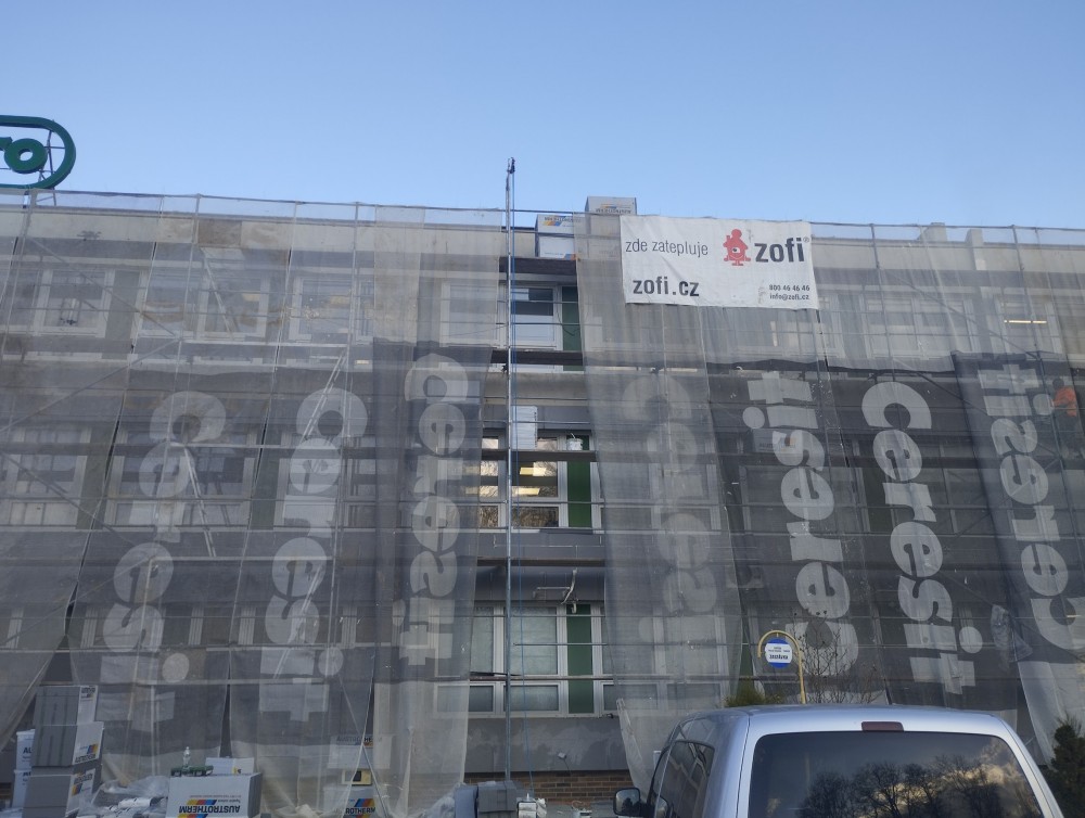 V této fázi bylo nutné přesně koordinovat termíny s ostatními profesemi. Jako stavbyvedoucí jsem proto zkontaktoval subdodavatele pro montáž hromosvodu, vzduchotechniky, žaluzií i elektroinstalací, protože tyto prvky bylo nutné instalovat ještě před demontáží lešení. Počasí nám bohužel příliš nepřálo a na zadní straně objektu musely být žaluzie instalovány z plošiny. Vzhledem k deštivému období bylo nutné lešení demontovat dříve, aby nedošlo ke znečištění nové fasády.