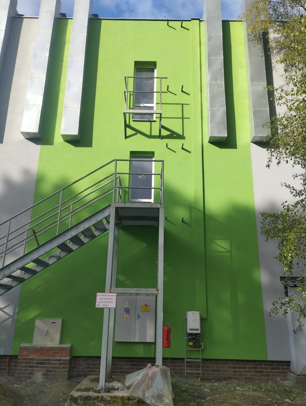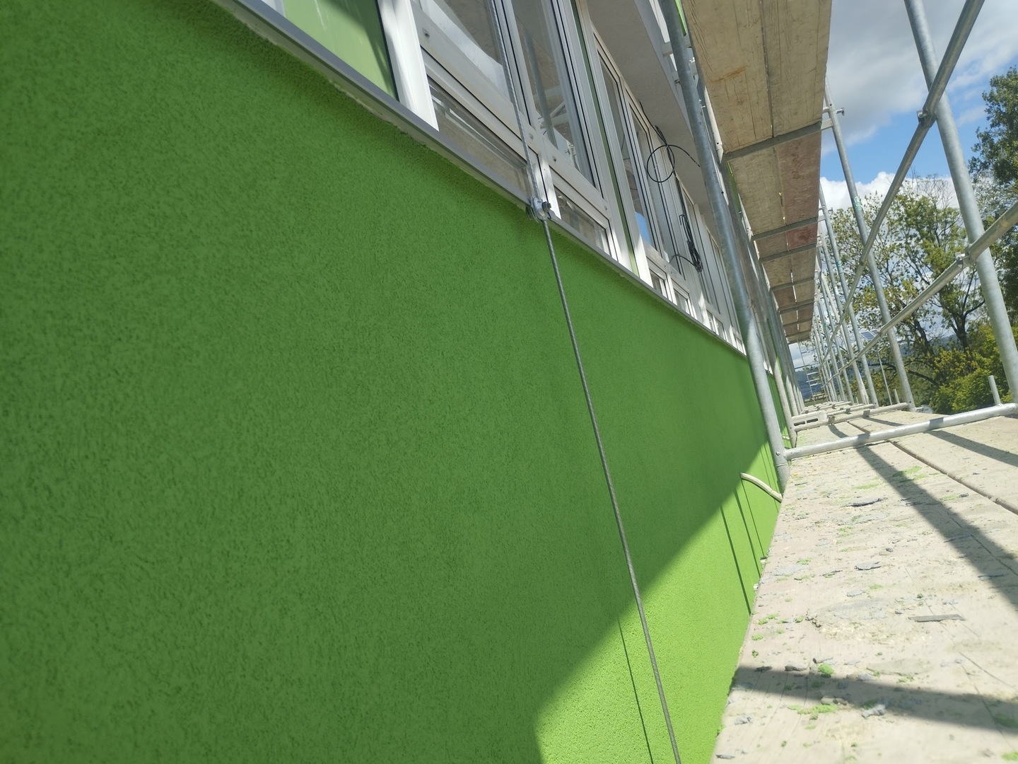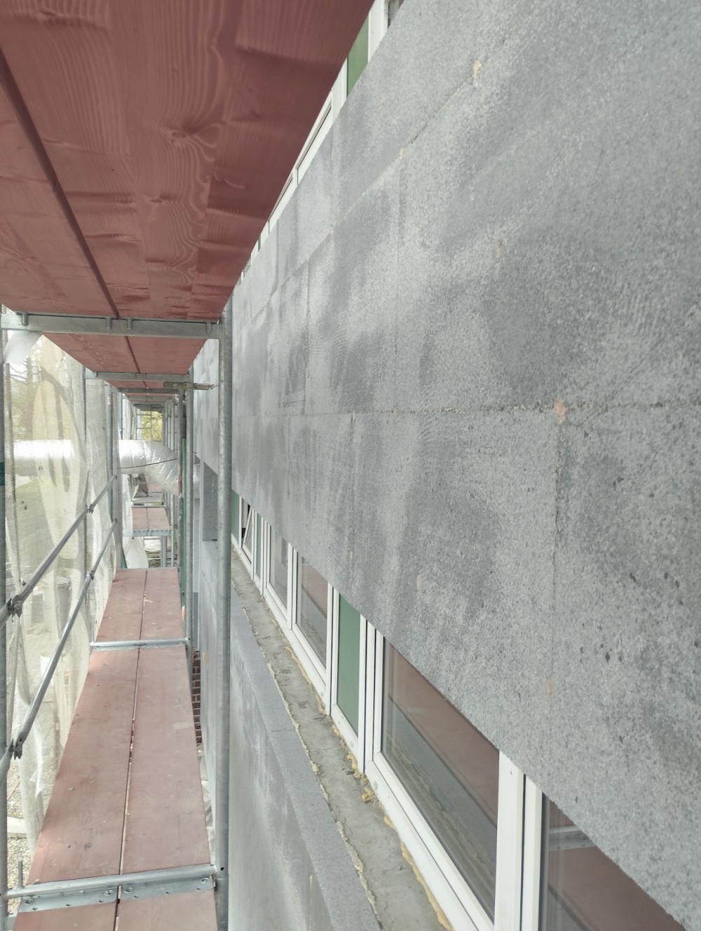 V této fázi bylo nutné přesně koordinovat termíny s ostatními profesemi. Jako stavbyvedoucí jsem proto zkontaktoval subdodavatele pro montáž hromosvodu, vzduchotechniky, žaluzií i elektroinstalací, protože tyto prvky bylo nutné instalovat ještě před demontáží lešení. Počasí nám bohužel příliš nepřálo a na zadní straně objektu musely být žaluzie instalovány z plošiny. Vzhledem k deštivému období bylo nutné lešení demontovat dříve, aby nedošlo ke znečištění nové fasády.