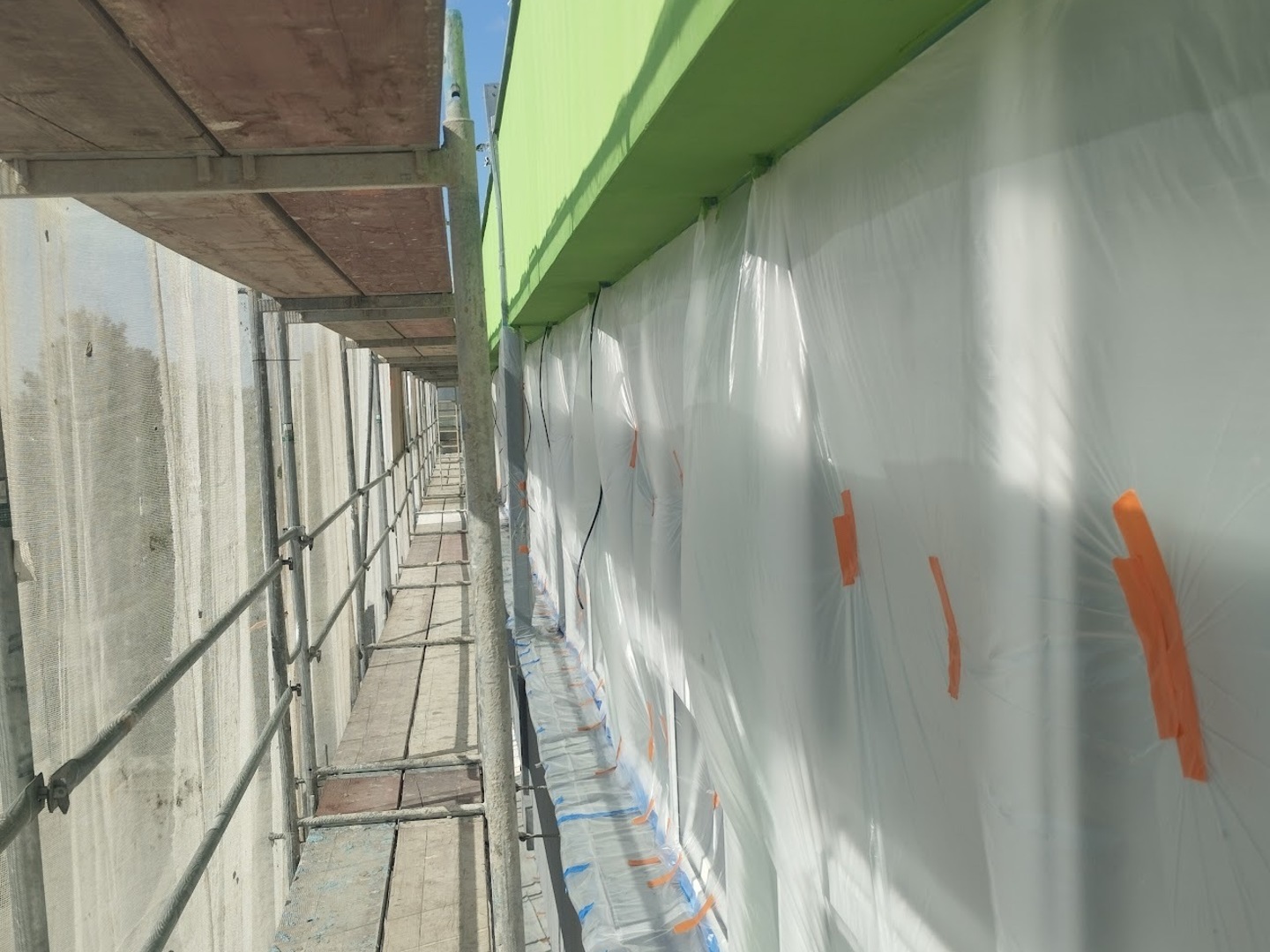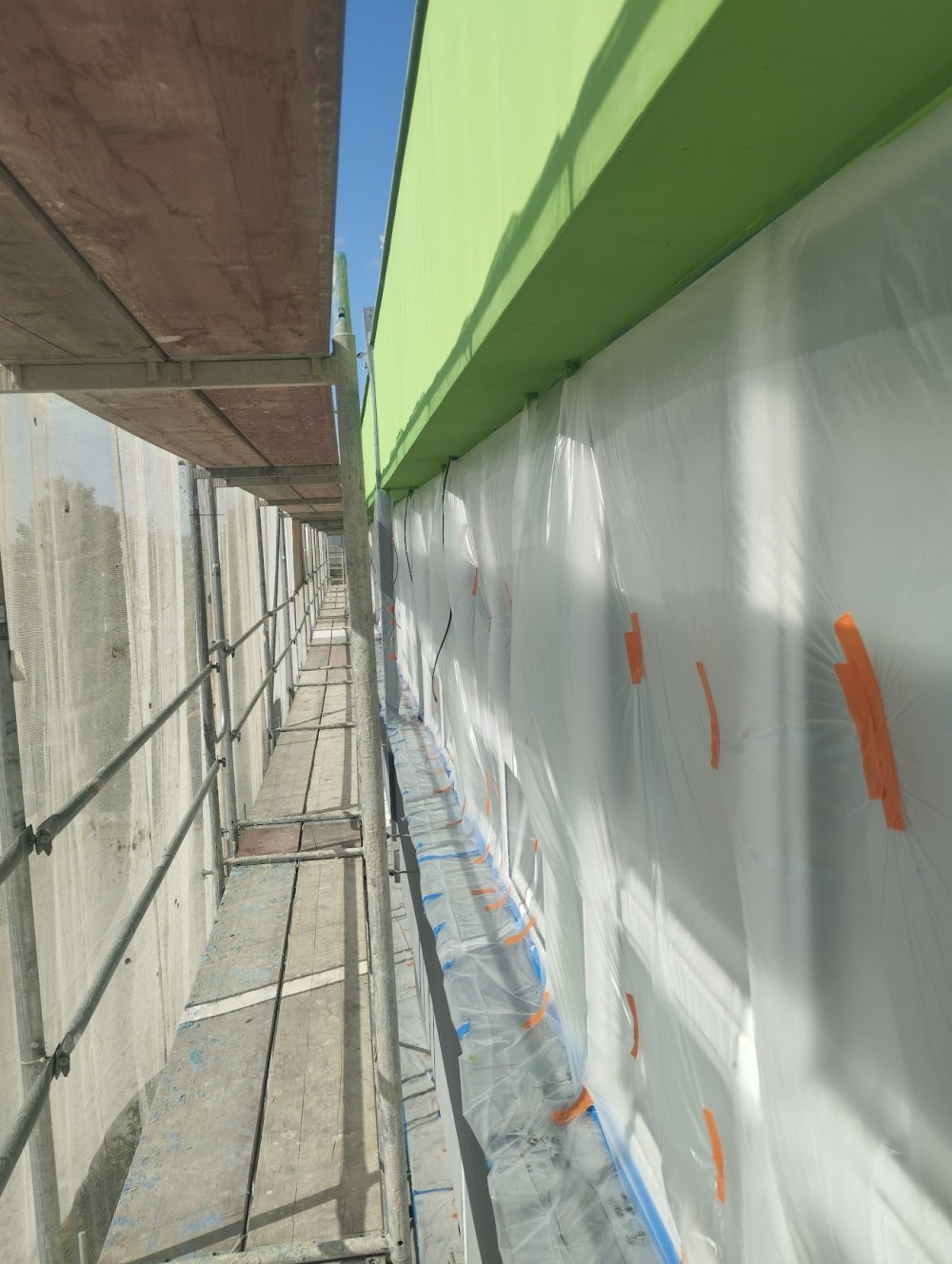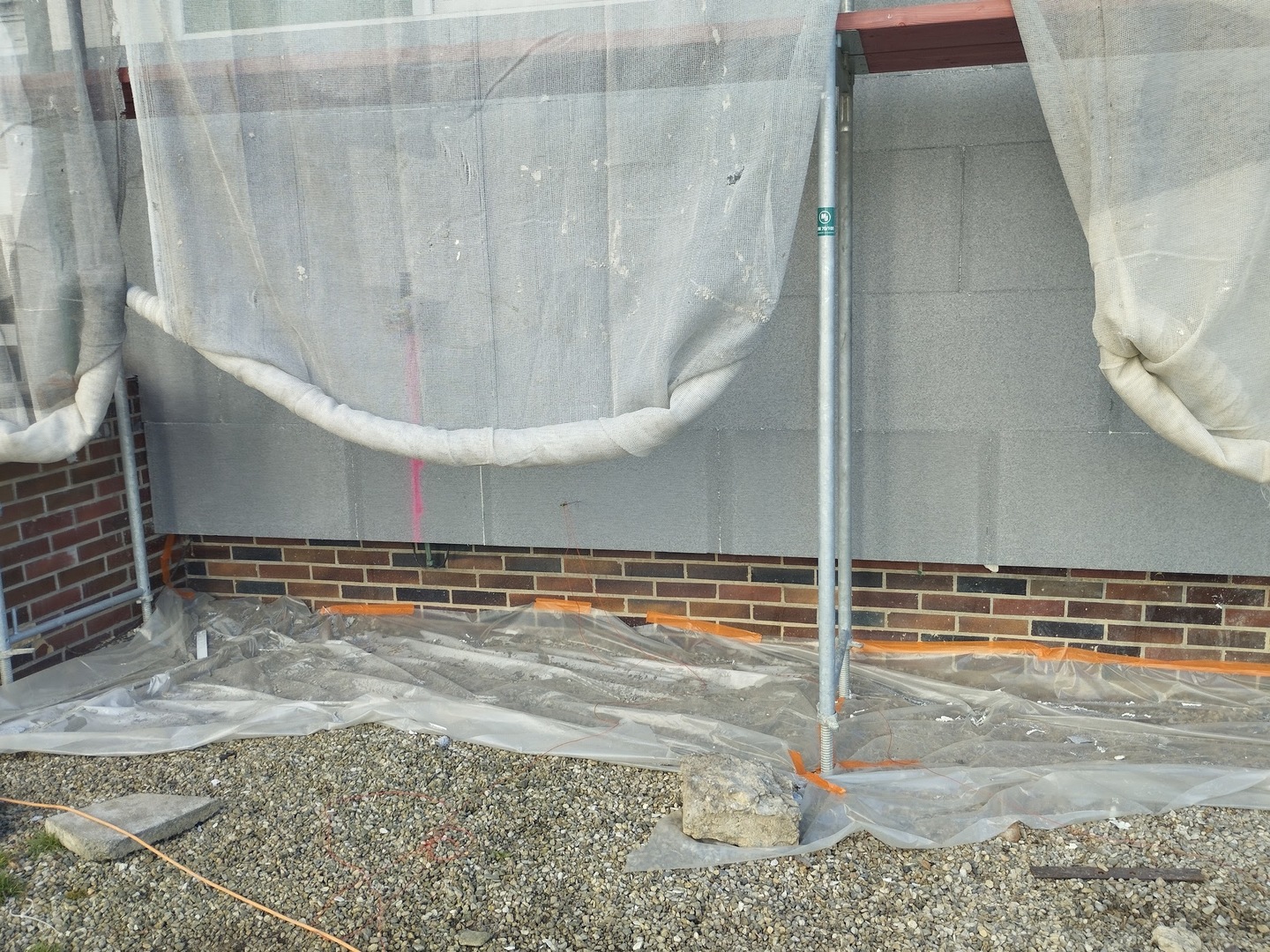 Po převzetí staveniště jsme nejprve připravili skladovací prostory pro materiál a následně začali s montáží lešení kolem celého objektu. Lešení bylo opatřeno ochrannými sítěmi, které zvyšují bezpečnost práce a zároveň chrání fasádu před nadměrným slunečním zářením.